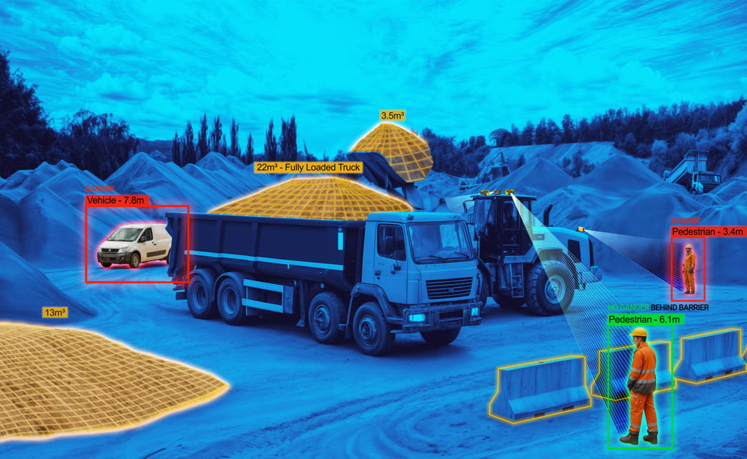 Because the algorithms are trained on real industrial environments—not generic image datasets—they can recognize pedestrians reliably even in difficult conditions such as dust, cluttered job sites, or low-light areas.